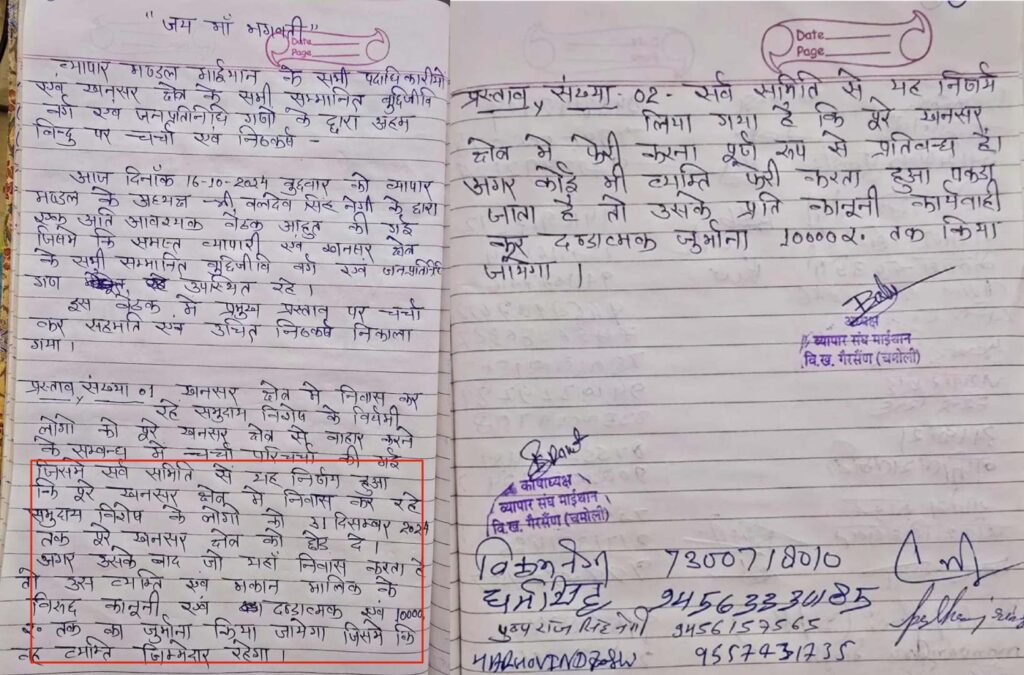 आफको बता दें कि चमोली के गौचर में हिंदू व्यापारी के साथ समुदाय विशेष के लोगों ने मारपीट की थी। इसके अलावा थराली क्षेत्र में नाबालिग लड़की के यौन शोषण औऱ उसका वीडियो वायरल करने का मामला सामने आया था। इन घटनाओं से हिंदू समाज में आक्रोश है। बीते 16 अक्टूबर को खानसर कस्बे में व्यापारियों के एक संगठन ने लगभग 15 मुस्लिम परिवारों को 31 दिसंबर तक शहर छोड़ने के लिए कहने का ‘प्रस्ताव पारित’ किया है। इनमें से कुछ मुसलमान तो दशकों से चमोली में रह रहे हैं। बैठक में पारित प्रस्ताव में कहा गया है कि इलाके में रह रहे मुस्लिम परिवार 31 दिसंबर तक शहर छोड़ दें। ऐसा न करने पर न केवल मुस्लिम परिवारों के खिलाफ बल्कि उन्हें अपना घर या दुकान किराए पर देने वालों के खिलाफ भी कानूनी और दंडात्मक कार्रवाई की जाएगी। ऐसे मकान मालिकों पर 10,000 रुपये का जुर्माना भी लगाया जाएगा।’ व्यापार मंडल के मुताबिक जनपद में इस तरह की घटनाओं के मद्देनजर अल्पसंख्यक समुदाय के सदस्यों द्वारा हिंदू महिलाओं के खिलाफ किसी भी आपराधिक घटना को रोकने के लिए ये निर्णय लिए गए हैं।