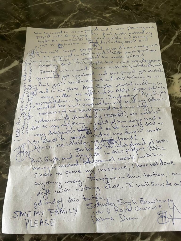 सतेंद्र सिंह साहनी के पास जो सुसाइड नोट मिला है, उसमें उन्होंने अपनी आत्महत्या के लिए साउथ अफ्रीका के बड़े बिजनेसमैन को जिम्मेदार ठहराया है। सतेंद्र सिंह साहनी ने अपने सुसाइड नोट में अनिल गुप्ता और अजय गुप्ता नाम के बिजनेसमैन पर निर्माणाधीन परियोजना में भागीदार के एग्रीमेंट के खिलाफ हस्तक्षेप करने का आरोप लगाया है। इसके अलावा सतेंद्र सिंह साहनी ने सुसाइड नोट में भाजपा के एक बड़े नेता बदलीत सोनी का नाम भी लिखा है। सुसाइड नोट में लिखा है कि बलजीत सोनी ने उन्हें प्रोजेक्ट के सिलसिले में अनिल गुप्ता से मिलवाया। हालांकि ससाइड नोट में ये भी जिक्र है कि बदलीजत सोनी के इरादे नेक और साफ थे
