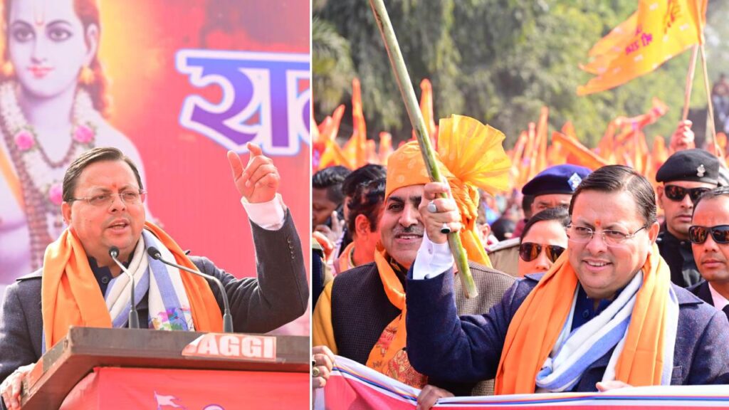 रैबार डेस्क: मुख्यमंत्री पुष्कर सिंह धामी ने शनिवार को देहरादून में “राम राज्य शोभायात्रा“ कार्यक्रम में प्रतिभाग किया। इस दौरान मुख्यमंत्री ने कहा कि सभी राम भक्तों का 500 से अधिक वर्ष का इंतजार खत्म होकर भव्य राम मंदिर बनने का सपना पूरा हो रहा है। हजारों साधु संतों राम भक्तों, सनातन प्रेमियों के बलिदान के उपरांत इस पुण्य दिन के हम सब साक्षी बनेंगे।