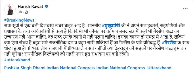 हरीश रावत ने लिखा है, ‘सत्ता सूत्रों से एक बड़ी दिलचस्प खबर बाहर आई है. माननीय मुख्यमंत्री जी ने अपने सलाहकारों, सहयोगियों और प्रशासन के उच्च अधिकारियों से कहा है कि किसी भी कीमत पर वर्तमान बजट सत्र में कहीं भी गैरसैंण शब्द का उच्चारण नहीं आना चाहिए। वो शब्द उनके कानों में नहीं पड़ना चाहिए। इसका कारण तो समझ में आता है, लेकिन क्या ऐसा संभव है।”बहुत सारे राजनीतिक दल और बहुत सारी शक्तियां हैं, जो गैरसैंण के प्रति प्रतिबद्ध हैं, गैरसैंण के साथ धोखा हुआ है। ग्रीष्मकालीन राजधानी में ग्रीष्मकालीन सत्र नहीं तो क्या देहरादून की सड़कों पर गैरसैंण शब्द इस बार नहीं गूंजेगा?राजनीतिक विश्लेषकों की गहरी नजर इस संभावना पर बनी रहेगी।’
