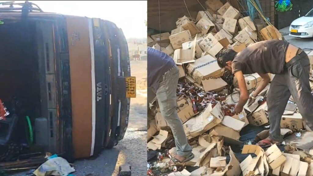 सड़क पर फैली शराब, पौड़ी जा रहा शराब से लदा ट्रक हाइवे पर पलटा