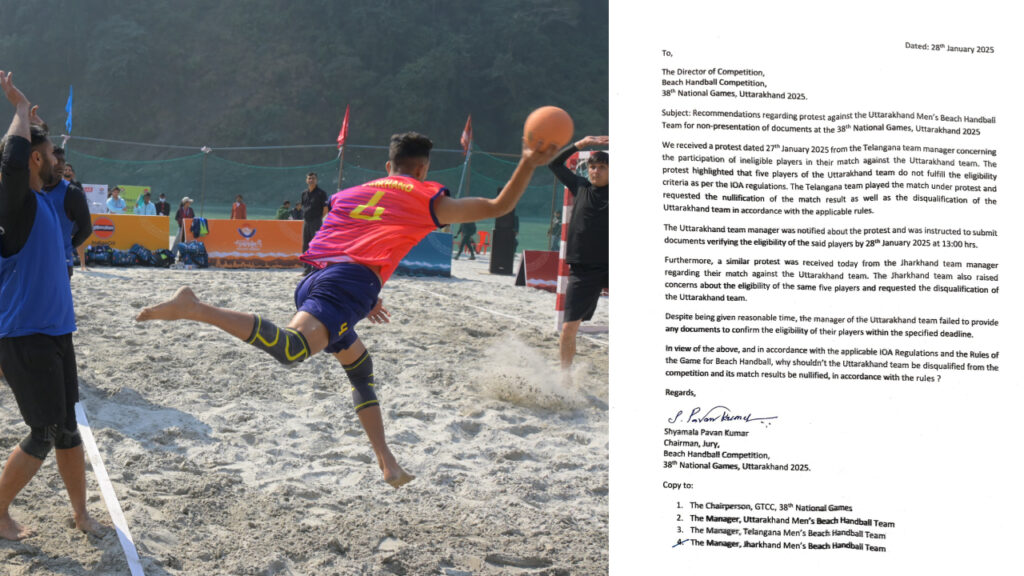27 जनवरी को शिवपुरी बीच पर खेले गए पुरुष वर्ग के मैच में उत्तराखंड की टीम ने तेलंगाना को 17-6, 19-12 से हराया था। जिसके बाद तेलंगाना टीम ने आरोप लगाया है कि उत्तराखंड की बीच हैंडबॉल टीम ने इंडियन ओलंपिक एसोसिएशन के मानकों का पालन नहीं किया है। तेलंगाना टीम ने कंपीटीशन ज्यूरी को शिकायत दर्ज की है। शिकायत में कहा गया है कि उत्तराखंड की टीम के कम से कम 5 खिलाड़ी ऐसे चयनित किए गए जो आईओए की गाइडलाइन के अनुरूप नहीं हैं। आईओए के पत्र संख्या IOA/38thNG/VI-61/2024/2104 में स्पष्ट किया गया है कि किसी भी टीम में खेलने वाला खिलाड़ी उस राज्य का स्थाई निवासी होन चाहिए या कम से कम 6 महीने पहले से वहां निवास करता हो।