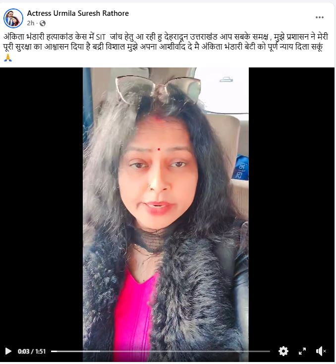 उधर अंकिता भंडारी केस में वीआईपी का खुलासा करने वाली उर्मिला सनावर ने कई दिनों बाद फेसबुक पर पोस्ट की है। उर्मिला ने लिखा है मैं अंकिता भंडारी हत्याकांड केस में SIT जांच में सहयोग करने के लिए देहरादून, उत्तराखंड आ रही हूं। उर्मिला ने लिखा है कि मुझे प्रशासन ने मेरी पूरी सुरक्षा का आश्वासन दिया है। बद्री विशाल मुझे अपना आशीर्वाद दें, मैं अंकिता भंडारी बेटी को पूर्ण न्याय दिला सकूं। इससे पहले उर्मिला ने एक वीडियो जारी किया जिसमें वो अपने मोबाइल की स्क्रीन रिकॉर्ड करके वीडियो बना रही हैं। उसमें सुरेश राठौर और उनके बीच किस तारीख को बातचीत की रिकॉटर्डिंग की गई है, उसका जिक्र है। इसस पहले उर्मिला ने फेसबुक पर लिखा था कि असुरों का नाश करने के लिए देवी को भी 9 महीने गर्भ जून में छुप कर रहना पड़ा था मैं 9 दिन के बाद अपने गर्भ जोन से बाहर आ रही हूं अपनी जान को बचाकर ,सबूतों के साथ अंकिता भंडारी को न्याय दिलाने। जय भवानी आ रही हूं उत्तराखंड SIT जांच के लिए। उम्मीद करती हूं शासन प्रशासन से ,अंकिता भंडारी मेरे से प्राप्त सबूतों के साथ कोई छेड़छाड़ ना करे।